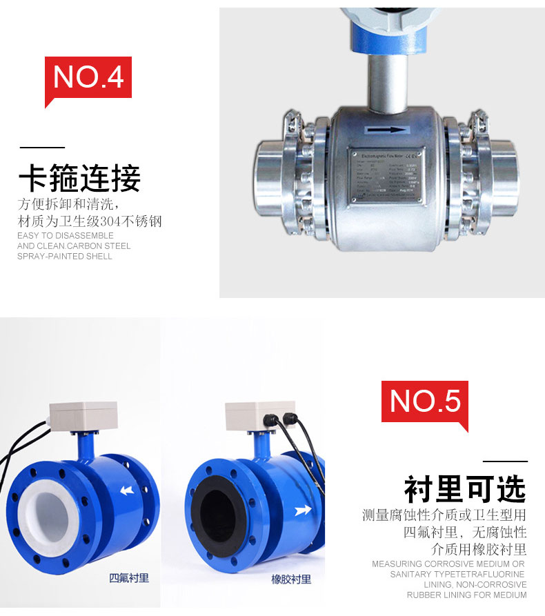 5、采用快速連接方案,電磁流量計便于拆卸、維護(hù)和清洗。智能轉(zhuǎn)換器采用液晶背光LED顯示器,即使在強(qiáng)光下或夜晚也能清晰讀數(shù)。