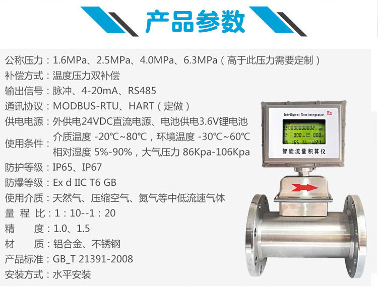 氣體渦輪流量計采用**的超低功耗單片微機技術研制的渦輪流量傳感器與顯示積算一體化的新型智能儀表,通過微處理單元對由溫度和壓力檢測模擬通道、流量傳感器通道采集的信號按照氣態方程進行溫度壓力補償,自動進行壓縮因子修正,在液晶顯示器將全部數據(瞬時流量、日累積流量、總累積流量、溫度、壓力、時間、日期、電池電量)直觀的顯示出來,并可輸出工況、標況脈沖信號、4-20mA、RS485通訊等多種通訊信號。