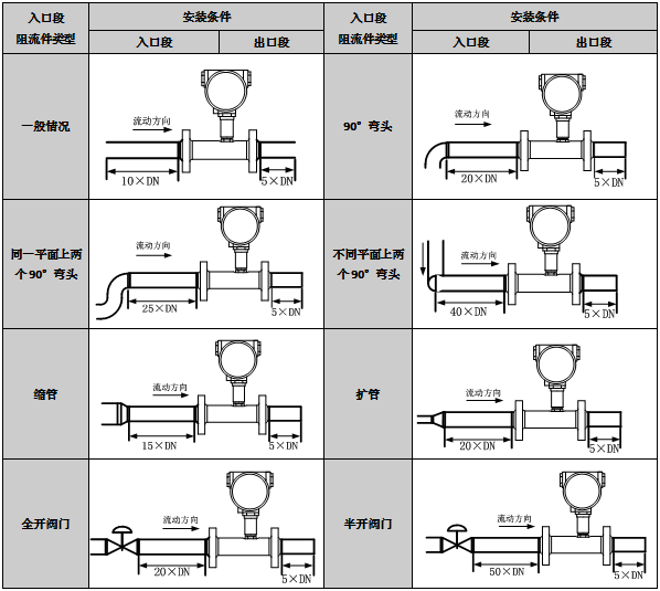 渦輪流量計對管道內流速分布畸變及旋轉流是敏感的,進入傳感器應為充分發展湍流,因此要根據傳感器上游側阻流件類型配備必要的直管段或整流器,要求入口段和出口段直管段長度。