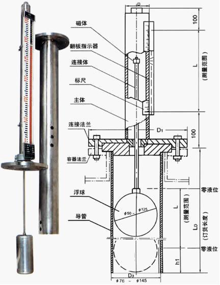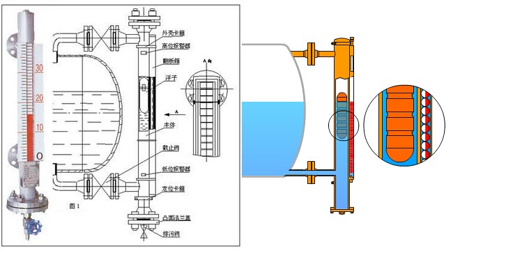 以浮子內磁鋼驅動雙色薄片的翻轉來指示液位的一種新型儀表。磁翻板液位計的主體內磁浮子隨液位的升降而上下運動,同時驅使主體外指示器內的雙色薄片翻轉,有液位時轉示紅色、無液位時轉示白色。紅色和白色色帶間的界線即代表液位高度。在指示器左側配有醒目的刻度標尺。從而使液位的指示顯得更加清晰